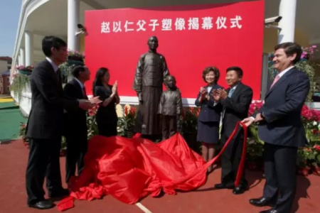 △趙小蘭與父親趙錫成、妹妹趙安吉一行回到上海家鄉(xiāng)嘉定馬陸鎮(zhèn),出席以仁幼兒園命名20周年慶典,并為先輩趙以仁和父親趙錫成的塑像揭幕。