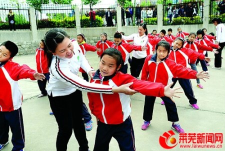 華裔志愿者走進山東萊蕪小學校園傳授健康操