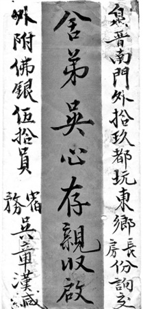 謹稟者,刻接五月廿七日及六月初拾日回音兩緘。啟讀之余,諸情敬悉祥矣。其信尾囑買正燕窩及洋線,若到岷之時自當購買,隨身帶回應用……大約至八月尾方能起程。祈大人勿以兒為念是幸。際此天氣炎熱,伏維大人保重玉體為要,此則兒望風遙祝者也……今逢信局之便,順付去佛銀伍拾大元,到祈收入以為大人甘旨之敬。便中示復為盼,余情后當面稟可也。肅此處請并頌