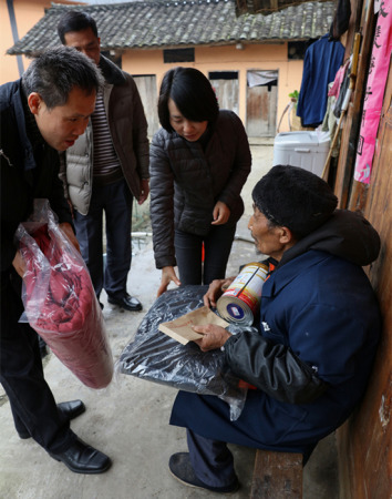 中國僑網1月9日電 據貴州省僑聯消息,近日,貴州省僑聯主席呂虹、副主席陳新倫一行帶上慰問金及輪椅、棉被、棉衣、鞋子等到遵義市余慶縣大烏江鎮(zhèn)紅渡村走訪慰問困難群眾。