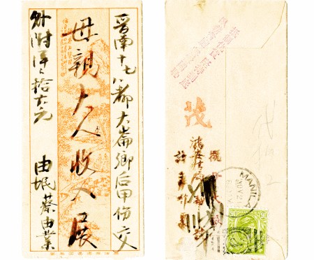 下圖僑批的背面蓋有“抵制日貨,堅(jiān)持到底。臥薪嘗膽,誓雪國(guó)恥”抗日宣傳戳,可見(jiàn)菲律賓華僑對(duì)抵制日貨的決心。該僑批1932年11月21日由馬尼拉寄往福建晉江十七八都大侖鄉(xiāng)(今屬石獅大侖),由馬尼拉鴻安信局轉(zhuǎn)駁,印有馬尼拉1932年4月2日郵戳。