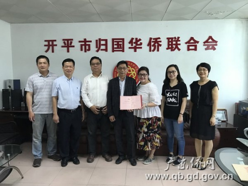 中國(guó)僑網(wǎng)7月27日電 據(jù)廣東省僑辦網(wǎng)站消息,近日,旅港僑胞吳榮旭攜眷到江門開平考察商機(jī),回鄉(xiāng)尋根,開平市僑聯(lián)聘請(qǐng)其為僑聯(lián)顧問。