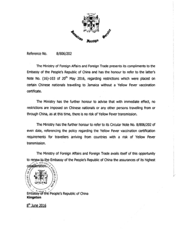 中國僑網(wǎng)7月5日電 據(jù)中國駐牙買加大使館消息,為避免中國公民前往牙買加時因無黃熱病接種證明而無法順利登機或通關(guān),請大家赴牙前將牙外交部照會打印出來,隨身攜帶。如航空公司或機場人員要求提交黃熱病接種證明,可向其出示該照會,請其放行。