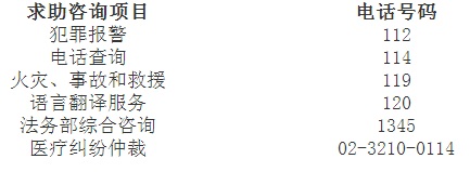 韓國常用求助咨詢電話: