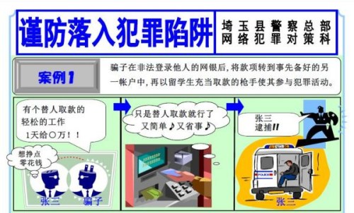 比如犯罪團(tuán)伙利用QQ、BBS論壇、電子郵件、廣告?zhèn)鲉位蚴烊私榻B,以“有一份好工作”、“只要接收貨物后將它轉(zhuǎn)送到其它指定場(chǎng)所”、“只要從賬戶(hù)提取現(xiàn)金”、“短時(shí)間內(nèi)便可獲取可觀(guān)報(bào)酬的工作”等甜言蜜語(yǔ)為誘餌對(duì)剛來(lái)日本不久的留學(xué)生進(jìn)行勸誘。