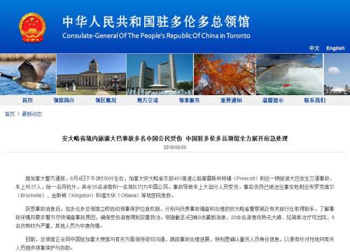 獲悉事故消息后,駐多倫多總領(lǐng)館立即啟動(dòng)領(lǐng)事保護(hù)應(yīng)急機(jī)制,分別與負(fù)責(zé)事故調(diào)查和處理的安大略省警察局及有關(guān)旅行社取得聯(lián)系,了解事故詳情,并要求警方盡快調(diào)查事故原因,確保受傷游客得到妥善救治。