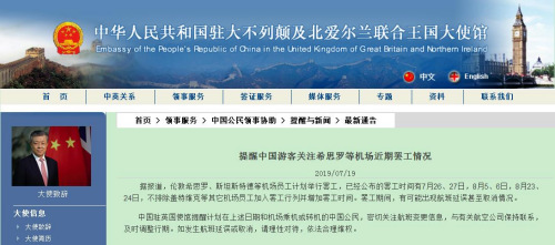 中國(guó)駐英國(guó)使館提醒計(jì)劃在上述日期和機(jī)場(chǎng)乘機(jī)或轉(zhuǎn)機(jī)的中國(guó)公民,密切關(guān)注航班變更信息,與有關(guān)航空公司保持聯(lián)系,及時(shí)調(diào)整行期。如發(fā)生航班延誤或取消,請(qǐng)理性對(duì)待,依法合理維權(quán)。