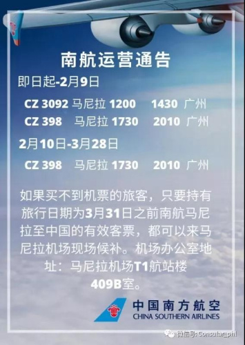 現(xiàn)提醒在菲滯留的中國旅客注意以下航班客票信息: