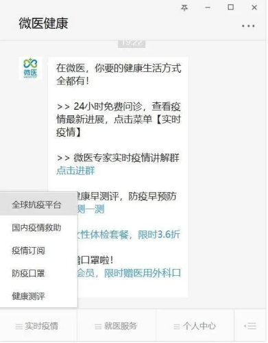 (一)進(jìn)入方式:關(guān)注“微醫(yī)健康”公眾號,點(diǎn)擊底部“實(shí)時(shí)疫情-全球抗疫平臺(tái)”。