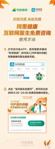 使用方法:打開支付寶APP,首頁搜索關(guān)鍵詞“科學(xué)防疫”,點(diǎn)擊進(jìn)入【守護(hù)海外僑胞】阿里健康問醫(yī)生服務(wù)頁面,即可免費(fèi)咨詢國內(nèi)醫(yī)生。