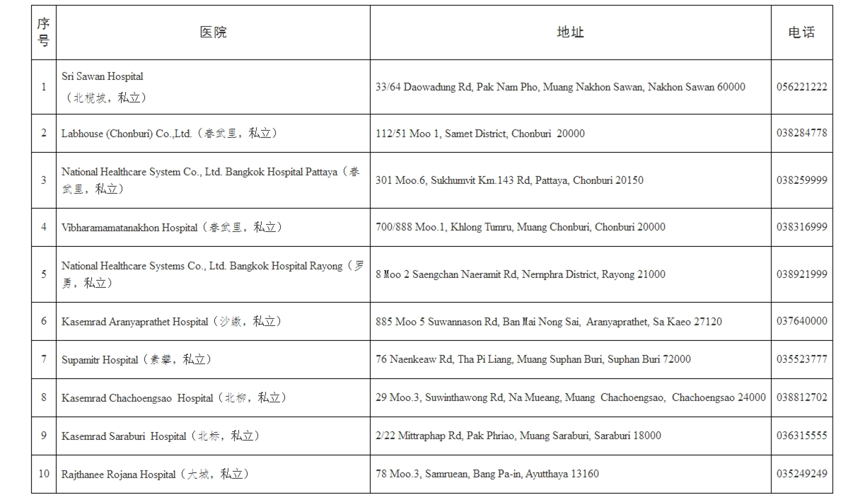 為方便赴華乘客進(jìn)行新冠病毒核酸檢測,經(jīng)與泰國公共衛(wèi)生部及相關(guān)醫(yī)療機(jī)構(gòu)多方聯(lián)系確認(rèn),現(xiàn)預(yù)先公布具有新冠病毒核酸檢測資質(zhì)的醫(yī)療機(jī)構(gòu)名單。待使館發(fā)布具體實(shí)施辦法通知后,請根據(jù)相關(guān)要求做好檢測。