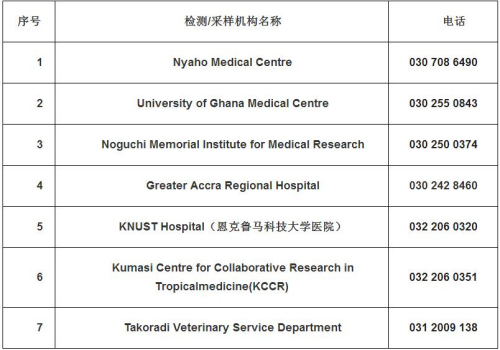 經(jīng)與加納相關(guān)醫(yī)療機構(gòu)聯(lián)系確認,使館現(xiàn)暫時公布核酸檢測機構(gòu)名單(以后視實施情況動態(tài)調(diào)整)如下: