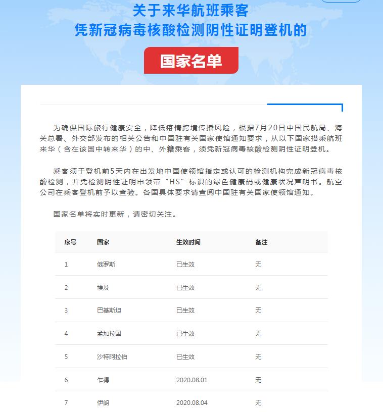 部分國家(實施核酸檢測措施國家名單如下圖)已實施赴華乘客憑新冠病毒核酸檢測陰性證明登機(jī)的措施。鑒此,自加拿大出發(fā),經(jīng)上述國家中轉(zhuǎn),搭乘航班赴華的中、外籍乘客,須預(yù)先在加拿大完成核酸檢測,并憑核酸檢測陰性證明申領(lǐng)帶“HS”標(biāo)識的綠色健康碼或健康狀況聲明書。航空公司將在乘客中轉(zhuǎn)登機(jī)前予以查驗。需要強(qiáng)調(diào)的是,擬在上述國家中轉(zhuǎn)赴華的乘客,請務(wù)必確保在中轉(zhuǎn)時上述健康碼或健康狀況聲明書有效,否則將造成滯留等后果。