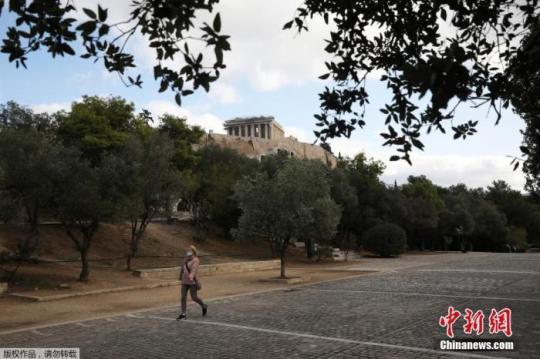 資料圖:當(dāng)?shù)貢r(shí)間11月7日,希臘雅典,一名戴口罩女子經(jīng)過(guò)帕特農(nóng)神廟。