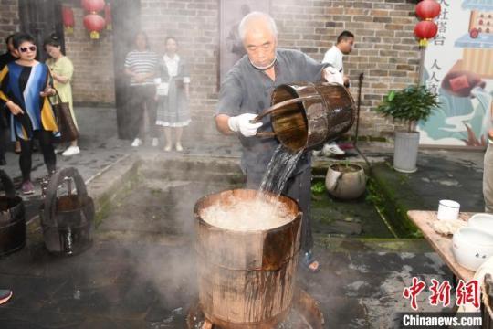 長樂甜酒釀造技藝非遺傳承人熊湘和展示甜酒釀造。中新網(wǎng)記者 楊華峰 攝