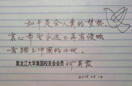 黑龍江大學(xué)美國校友會(huì)何英霞和平寄語(圖)