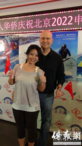 胡艷秋和他的“老外”老公史蒂芬揮動著中國國旗支持北京申奧。(美國《僑報》/高睿 攝)