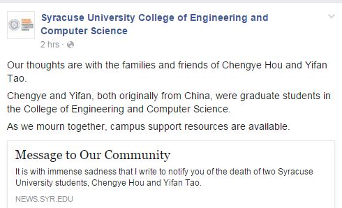 雪城校方表示,兩名學(xué)生就讀于該校工程和電腦科學(xué)學(xué)院,預(yù)計(jì)2017年畢業(yè)。另外一名受傷的學(xué)生也來(lái)自中國(guó)。
