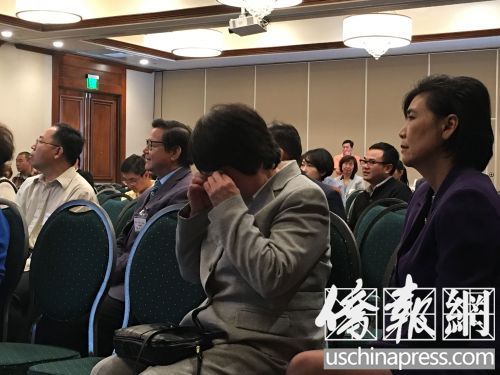 在當(dāng)?shù)貢r間20日舉行的為華裔科學(xué)家獲取正義的募捐活動中,陳霞芬女士在眾多華裔民眾的支持下感動落淚。(聶達(dá))