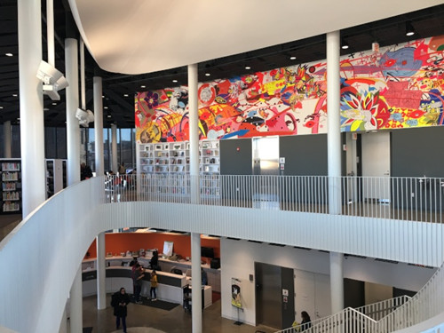 樓高二層,外觀新穎現(xiàn)代的華埠圖書館,二樓一幅巨型壁畫彰顯華人意象,16370平方英尺的使用面積,圖書館內(nèi)設(shè)施,涵蓋早期教育園地、提供3D打印等科技設(shè)備的YOUmedia中心、大小會議室等。