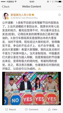這檔節(jié)目的嘉賓之一、日籍華人李小牧事后在微博上道歉稱,當天臨時拿到腳本,自己的一段發(fā)言按照腳本大意進行。經(jīng)過網(wǎng)民的批評后他認識到不妥,爭論的不在點子上,不合乎情理,有種被利用的感覺。
