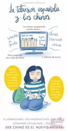 一位華裔的漫畫家在西班牙電視臺上吐槽了這次事件,用一個中國女孩的形象表達出西班牙媒體貶低中國游客形象的不滿?!翱磥碇袊爽F(xiàn)在還挺時髦,總是上電視,但是總是圍繞一個話題在說??墒菫槭裁催@些媒體就不能開一個更高級點的玩笑呢?”