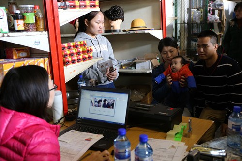 超市內(nèi),使館工作人員用兩張飯桌拼成了臨時接案臺,架設(shè)好電腦、指紋儀和攝像頭,隨即開始咨詢和接案。此次現(xiàn)場辦公證件申請量大、種類多,申請人情況各有不同。接案人員指導(dǎo)申請人填寫表格,詢問具體情況,完成接案流程。