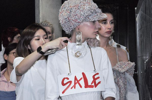 在6月剛剛完成的畢業(yè)展上,彭琳景創(chuàng)作了主題為“過(guò)度消費(fèi)”的作品,展現(xiàn)了她對(duì)傳統(tǒng)與后現(xiàn)代時(shí)尚消費(fèi)的思索,也透露著她對(duì)整個(gè)時(shí)尚行業(yè)充滿哲學(xué)意味的諷刺。設(shè)計(jì)靈感來(lái)源于上世紀(jì)80年代的一張海報(bào),當(dāng)時(shí),英國(guó)的Banner girls 在身上掛滿鞋子,穿著溜冰鞋到處兜售,手里還拿著傳單?!巴ο瘳F(xiàn)在,人們對(duì)于名牌的追求大過(guò)于設(shè)計(jì)本身,全身穿著名牌招搖過(guò)市,像個(gè)巨幅移動(dòng)廣告,有些品牌甚至開(kāi)始迎合商業(yè)市場(chǎng),不去追問(wèn)設(shè)計(jì)的意義與價(jià)值?!迸砹站敖o衣服縫上了無(wú)數(shù)條形碼標(biāo)簽、密密麻麻的口袋、小裙子,夸張的設(shè)計(jì)與Logo 無(wú)一不在表達(dá)著她強(qiáng)烈的藝術(shù)觀點(diǎn),十分奪人眼球。