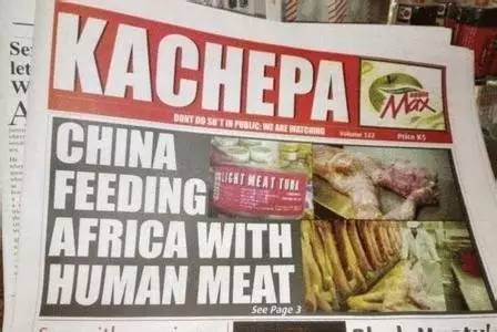 5月17日,贊比亞一家當(dāng)?shù)匦?bào)KACHEPA頭版竟然出現(xiàn)一篇題為“中國(guó)用人肉來(lái)毒害非洲人民”的文章。