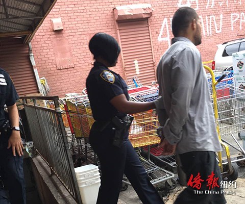 中國僑網(wǎng)8月11日電 據(jù)美國《僑報》報道,當(dāng)?shù)貢r間10日,一名西裔盜賊企圖盜竊位于紐約法拉盛緬街的一家華人超市貨品,華裔店員齊心協(xié)力將其抓獲,扭送給趕來的109警員。