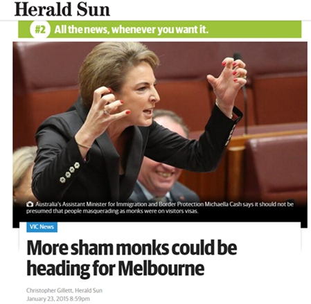 澳大利亞《先鋒太陽報》2015年的一則報道稱,在新西蘭當局大力打擊虛假乞討詐騙犯罪后,新西蘭已經(jīng)警告澳大利亞政府,一個亞洲犯罪集團正在中國廣招騙子去澳大利亞行騙。報道稱,只要花大約2000澳元(約合1萬元人民幣)的費用,這些騙子就可以被訓練成和尚、尼姑、江湖郎中或算命先生。