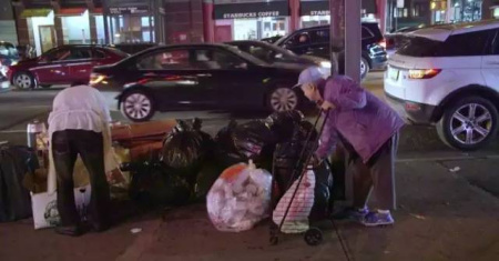 冬日的夜晚,她蹣跚地走在街頭,推著一部小型手推車(chē),在垃圾堆里挑揀起了尚可食用的面包。