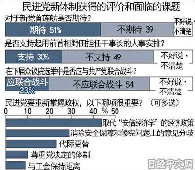 但蓮舫起用了執(zhí)政期間遭遇民主黨政權(quán)下臺(tái)的野田佳彥擔(dān)任干事長(zhǎng),重用曾在野田政權(quán)擔(dān)任要職的高官。民進(jìn)黨黨內(nèi)對(duì)蓮舫上任后一系列的人事安排批評(píng)聲很高。在民進(jìn)黨支持階層中,對(duì)于起用野田的安排,“支持”占57%,而“不支持”為37%?!安恢С帧痹跓o黨派階層中接近半數(shù),而在共產(chǎn)黨支持階層中接近3分之2。