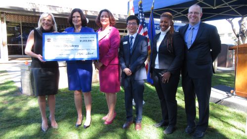 同日,天普市也進(jìn)行了圖書館擴(kuò)建項(xiàng)目啟動(dòng)儀式。下午1時(shí),天普市圖書館迎來了帶著大支票的洛杉磯縣第五區(qū)和洛縣圖書館官員們。