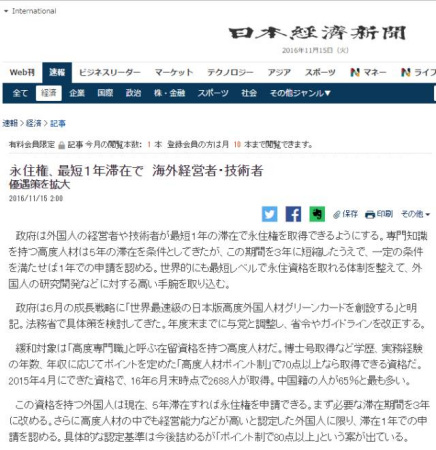 中國(guó)僑網(wǎng)11月16日電 據(jù)日本《東方新報(bào)》報(bào)道,15日的《日本經(jīng)濟(jì)新聞》發(fā)布報(bào)道稱日本政府即將推出吸引海外人才的政策:“外國(guó)高級(jí)人才最短一年可以拿日本永住權(quán)?!?消息立刻引起了在日華人的注目。那么,這次究竟日本的政策會(huì)開(kāi)放到什么程度?哪些人申請(qǐng)永住變得更加容易了呢?為了避免誤導(dǎo),還是先認(rèn)真讀一下報(bào)道的原文: