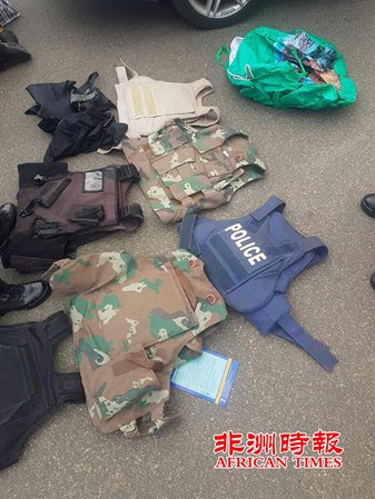 當(dāng)JMPD搜查嫌疑犯的車內(nèi)時發(fā)現(xiàn)了大批軍用自動步槍、彈藥和不同軍警部門的防彈背心和衣物。JMPD查扣了三把R5軍用步槍、七個彈夾和彈藥,兩件軍用、一件SAPS、一件矯正署、兩件保安公司的防彈背心,和一件SAPS毛衣。