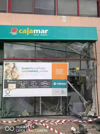 中國僑網11月22日電 據西班牙《歐華報》報道,11月21日凌晨,西班牙馬拉加幾名劫匪搶劫了位于華人批發(fā)區(qū)的Cajamar銀行,歹徒利用爆炸物將其大門炸毀,用重型起重設備將自動取款機抬走。造成銀行大門被全部損壞,玻璃和辦公設備全被震碎。因事發(fā)在凌晨,目前暫無人員傷亡。據銀行相關人員透露,銀行正在清點損失。