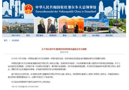 同日,也就是11月18日,中國駐德國大使館也發(fā)布公告稱,16日,中國駐杜塞爾多夫總領館接到一名中國女留學生報案,稱其在返回宿舍途中遭遇性侵并向警方報案。