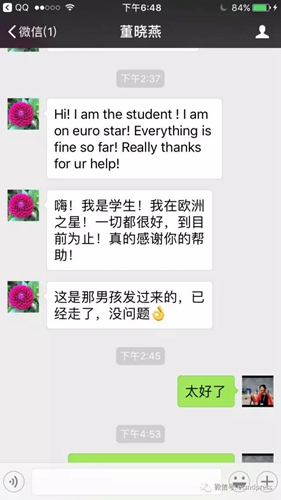 下午2:40分時(shí),董曉燕轉(zhuǎn)來了王同學(xué)發(fā)的微信:“嗨!我是學(xué)生!我在歐洲之星!一切都很好,到目前為止!真的感謝你的幫助!”