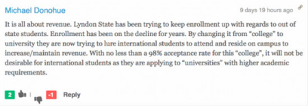 有佛蒙特州網(wǎng)友說,我非常感興趣中國留學(xué)生在其它美國高校的留校率。既然包括中國學(xué)生在內(nèi)的非本州學(xué)生更想去那些大型公立高校,那么北佛蒙特大學(xué)改名后的吸引效果能有多好呢?