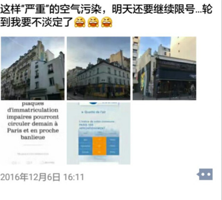 同樣在巴黎生活了20多年的華人尤先生告訴記者,巴黎全年基本還是藍天白云,即使是污染天也能看見藍天。現(xiàn)在很多人提起北京,就會想起霧霾,但是巴黎不會給人這樣的聯(lián)想。所以2016年12月6日至9日,巴黎市政府宣布巴黎正在遭遇十年來最嚴重的空氣污染,并實行單雙號限行的時候,很多見識過國內(nèi)霧霾的華人同胞更多的是在朋友圈里吐槽。尤先生給記者發(fā)來了一張他朋友圈的截圖。