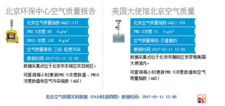 以2017年1月11日為例,負責(zé)監(jiān)控大巴黎地區(qū)空氣質(zhì)量的機構(gòu)Airparif給出的北京空氣質(zhì)量報告和北京環(huán)保中心給出的空氣質(zhì)量報告就不一樣。從下圖我們可以看出,當(dāng)Airparif給北京標(biāo)記為紅色警戒級別的時候,北京環(huán)保中心給出的等級是“輕度污染”,而1月11日當(dāng)天,北京的確可見藍天白云。這就不難理解,為何巴黎在遭遇近十年最嚴重空氣污染的時候,民眾看到的依然是藍天白云。