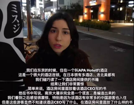 @千火翎:kat&sid,感謝你們,感謝你們的正直、客觀和勇敢,因為沒去過日本,無法對日本當(dāng)今的人和國家作出評價,但因為有你們的幫助,我們將不會讓一個對中國毫無尊重的人從我們這里得到任何利益,也希望更多的人能夠看到這個視頻,(不要住日本的APA HOTEL?。娴姆浅8兄x你們!support you guys forever!