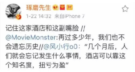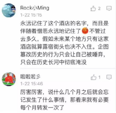 還有網(wǎng)友表示,“嗯,我們只會(huì)記得酒店名字,因?yàn)橐涀〗^對(duì)不會(huì)去這家破酒店?!?“說什么幾個(gè)月后就會(huì)忘記,那看來我有必要每個(gè)月轉(zhuǎn)發(fā)一次了”。