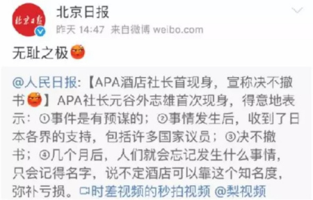 日本APA酒店的社長(zhǎng)說“人們很快就會(huì)忘記”,怎么可能忘?!他的這些言辭就是試圖淡化和抹殺歷史史實(shí),是典型愚弄老百姓的做法。