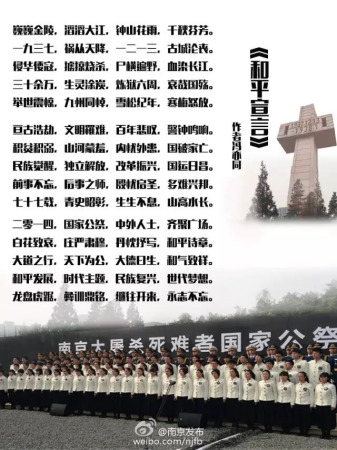 2014年12月13日,首個(gè)南京大屠殺死難者國(guó)家公祭日,77名少年宣讀了《和平宣言》。今天,我們?cè)俅斡谩逗推叫浴防锏囊痪湓捀嬖V元谷外志雄、告訴日本極右翼勢(shì)力,對(duì)于南京大屠殺這一歷史真相,吾輩 永志不忘 !