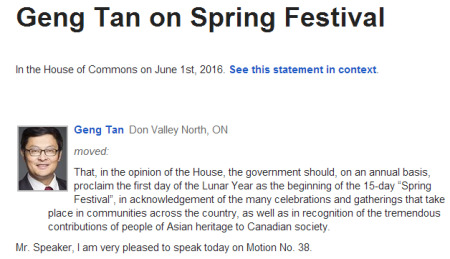 今天我的議員個人動議在加拿大國會獲得通過,加拿大官方將把每年農(nóng)歷正月初一到十五正式命名為春節(jié)!