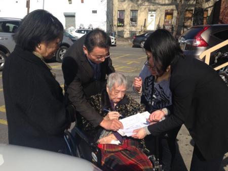 早上8點(diǎn)多開始,布魯克林亞裔社團(tuán)聯(lián)合總會所在的金皇庭酒樓一層大廳就涌進(jìn)了大批辦證僑胞,年長僑胞在親友的陪同下來到這里,在總領(lǐng)館領(lǐng)事和亞總會志愿者的指引下,拿號排隊(duì),有序辦證。