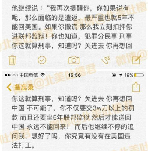 隨后,一位警官對(duì)“高宇仁”進(jìn)行了審訊。警官問(wèn)她是否曾在美國(guó)違法打工?“高宇仁”說(shuō)沒(méi)有,只在中國(guó)做過(guò)微商。警官卻并不相信,并稱(chēng)掌握了有關(guān)證據(jù),繼而掏出手銬,聲稱(chēng)如果她不承認(rèn)自己“非法打工”,就會(huì)有5年牢獄之災(zāi)。
