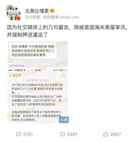 而去年2月,即已有留學(xué)生因?yàn)槲⑿帕奶熘械囊痪湓挾磺卜担?016年2月26日,一位中國(guó)女留學(xué)生曾因大半年前在微信中向朋友透露,“我不喜歡這個(gè)學(xué)校,只是臨時(shí)掛一下身份”,沒(méi)想到這段久遠(yuǎn)的聊天紀(jì)錄,竟然在入境美國(guó)時(shí)被海關(guān)看到,被盤(pán)問(wèn)三個(gè)多小時(shí)后,她立即被遣返回中國(guó)。